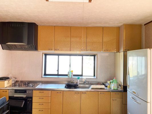M様邸キッチンリフォーム Before After ライトピンクのキッチン扉で明るい雰囲気にリフレッシュ。 IHクッキングヒーターや人工大理石カウンター、掃除しやすいフッ素パネルなど機能も向上しました。